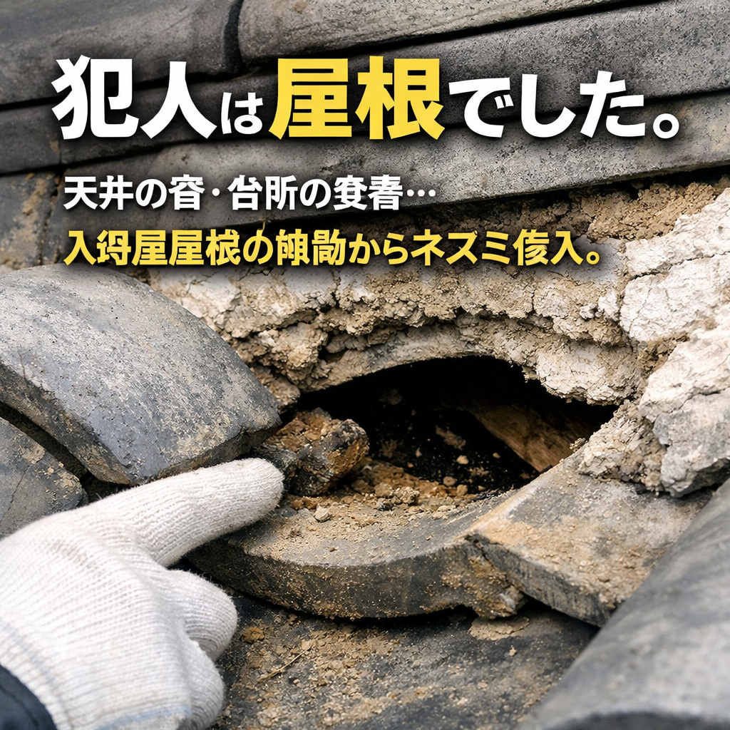 実は、駿河区内の一般住宅において、こうしたネズミ被害のご相談が急増しています。今回は、実際に当社が駆除を行った事例をもとに、意外な侵入経路である「屋根の入母屋(いりもや)の隙間」について解説します。