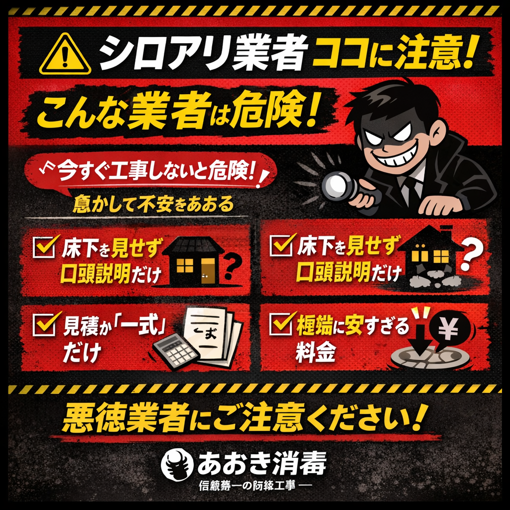 Q1. シロアリ予防工事で、悪徳業者によくある手口は何ですか?