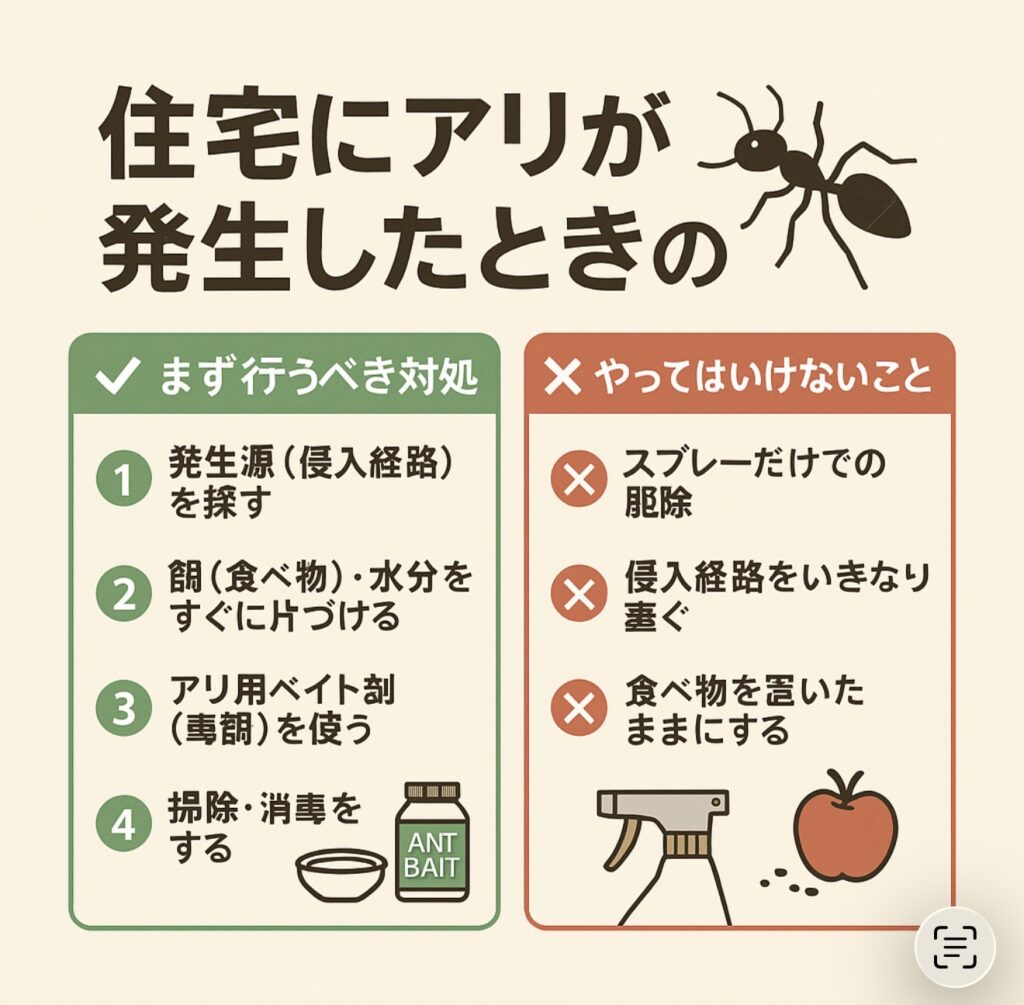 住宅にアリが発生したときは、種類によって対処法が変わりますが、一般家庭でまず行うべき対処と、絶対にやってはいけない注意点をわかりやすくまとめます。