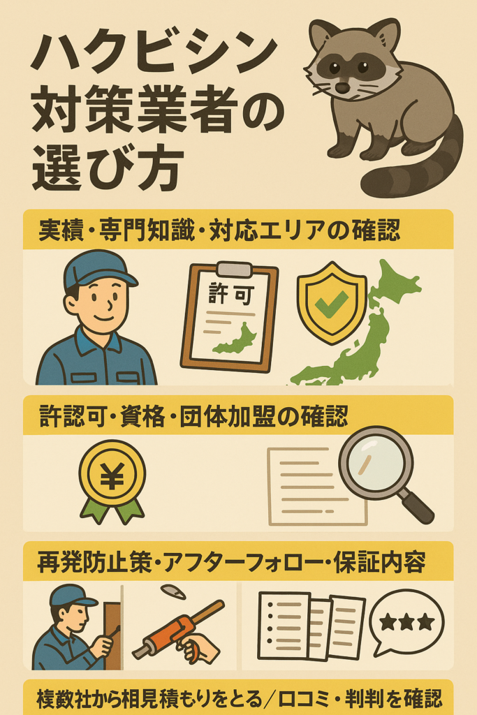 ハクビシン被害は、駆除だけでなく「清掃・消毒」「侵入口封鎖」「再発防止」がセットでなければ根本的な解決にならない。だからこそ、「実績・許認可・見積・保証」 という複数の観点で業者を慎重に選ぶことが大切。