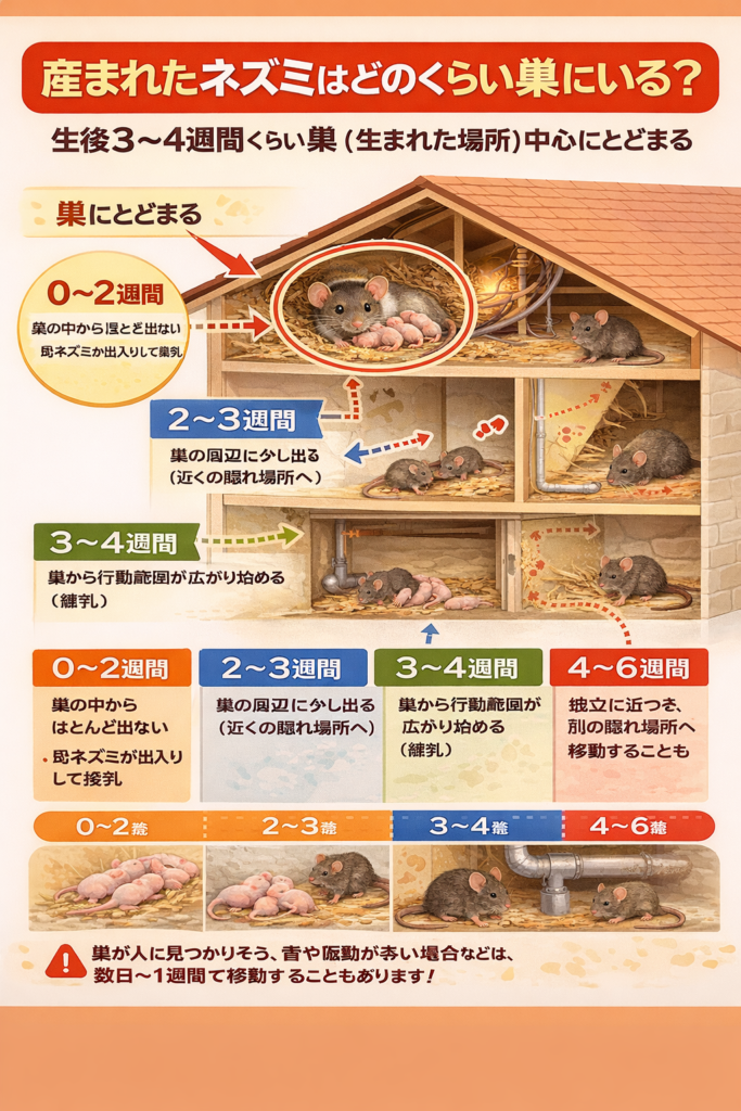 生後3〜4週間は「巣(産まれた場所)」中心にとどまる- 0〜2週間:巣の中からほぼ出ない(母ネズミが授乳)